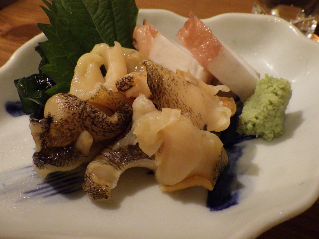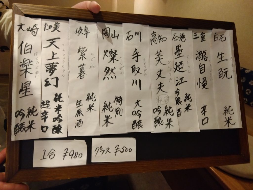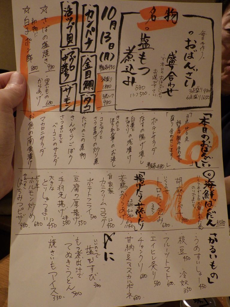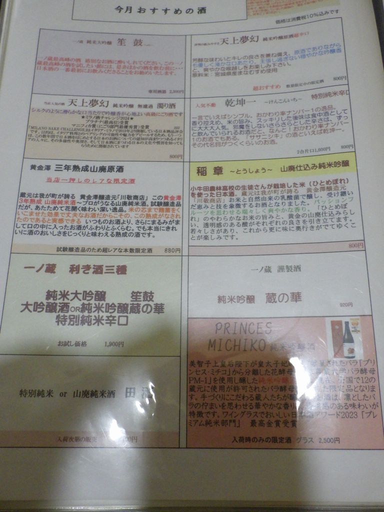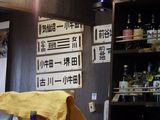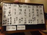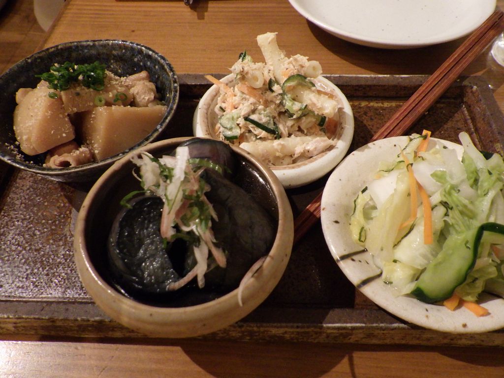 夕食-おばんざい盛合わせ (なすの揚げ浸し、たけのこの煮物、マカロニサラダ)、胡麻カンパチ、塩もつ煮込み、活ツブ貝、蔵王生酛純米、天上夢幻純米、白ホッピー
