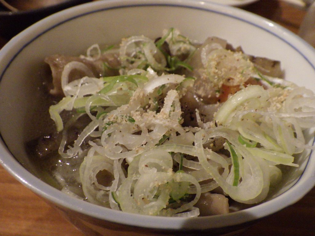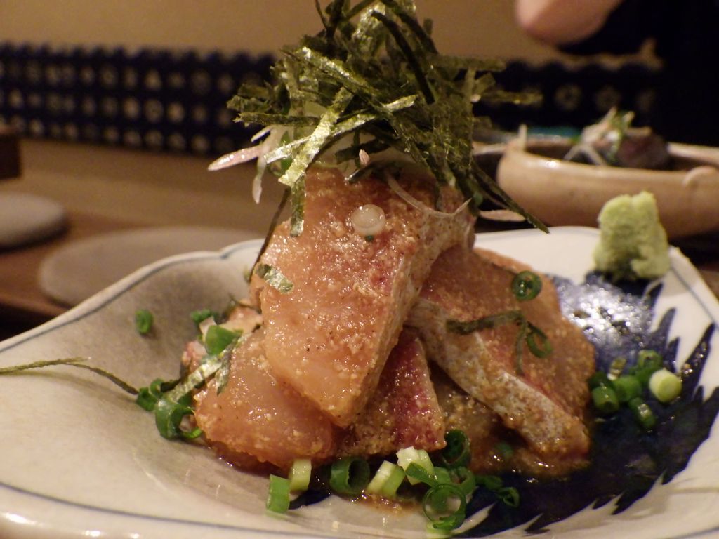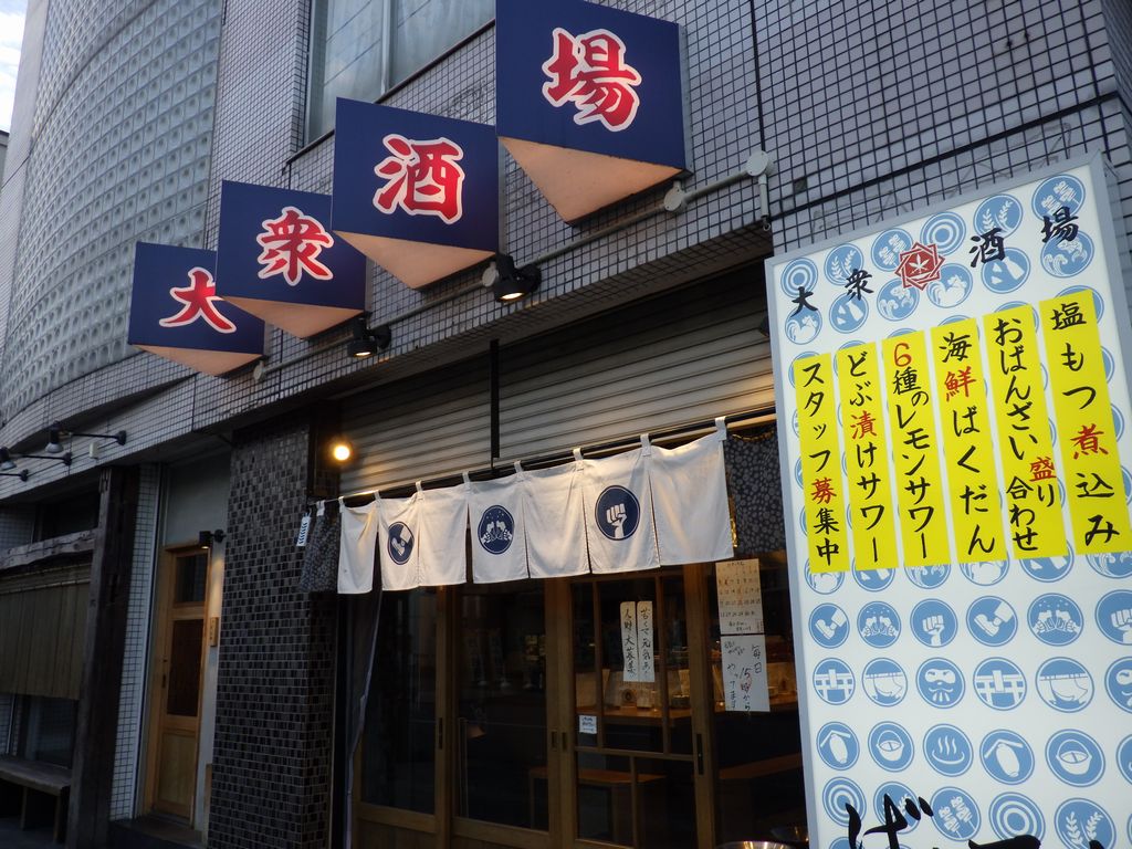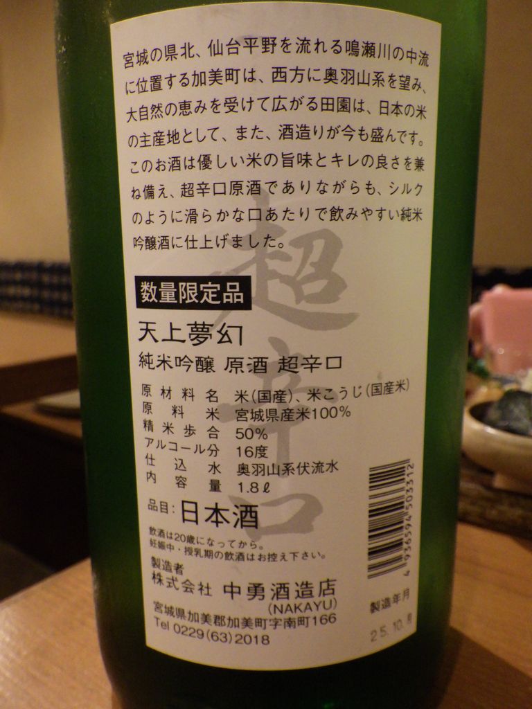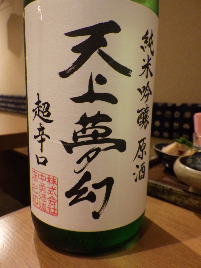 夕食-おばんざい盛合わせ (なすの揚げ浸し、たけのこの煮物、マカロニサラダ)、胡麻カンパチ、塩もつ煮込み、活ツブ貝、蔵王生酛純米、天上夢幻純米、白ホッピー