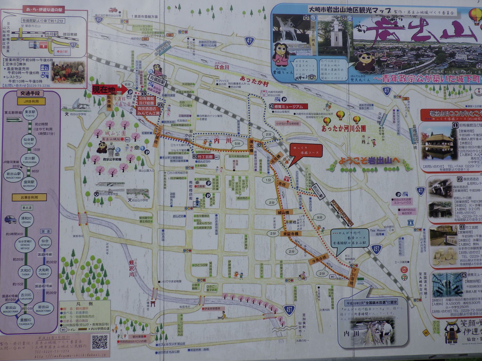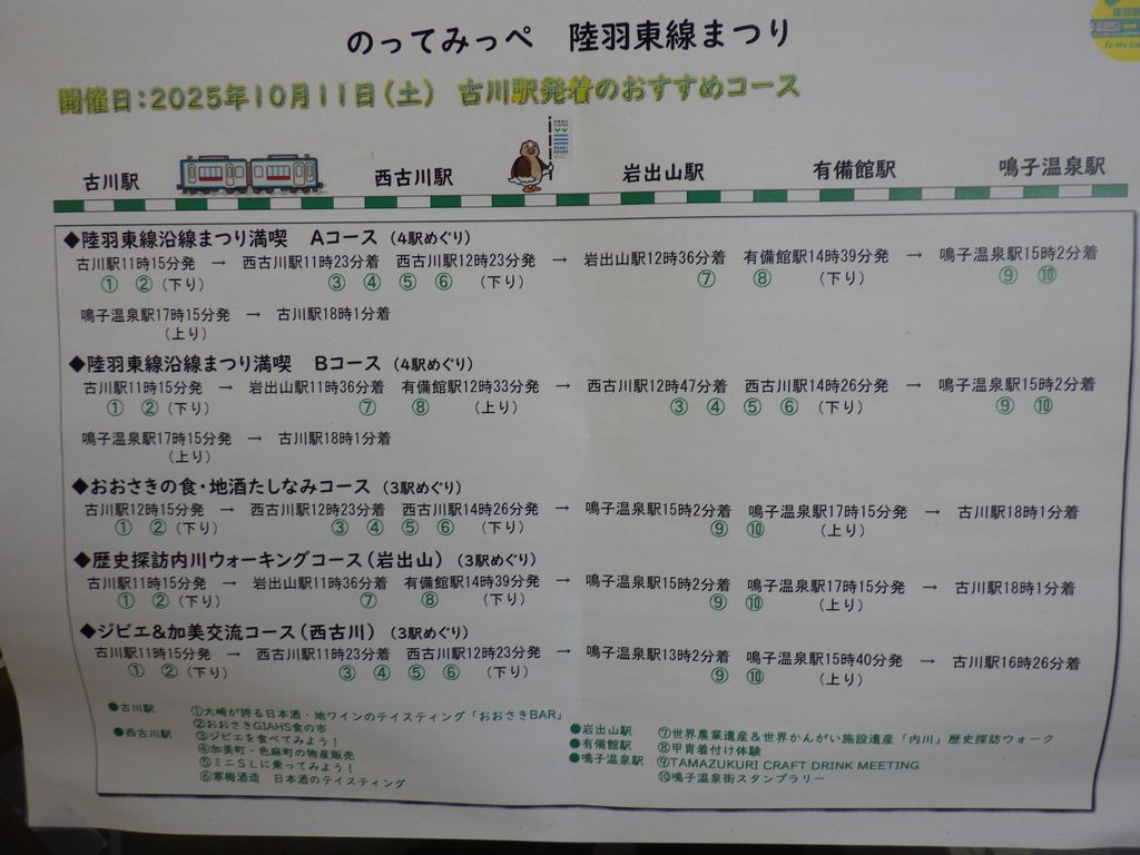 1ホテル「古川ヒルズ 古川駅前」 → 2古川駅 → 3(陸羽東線) → 4小牛田駅 → (石巻線) → 5涌谷駅 → 6光明院 → 7(道すがらの江合川沿い) → 8城山公園 → 9涌谷城 → 10涌谷神社 → 11神明社 → 12見龍寺 → 13「ヤマザキYショップ涌谷やましゅう」 → 14(道すがらの江合川沿い) → 15涌谷駅 → (石巻線) → 小牛田駅 → 16小牛田駅前居酒屋食堂「伊勢屋」 → 17小牛田駅 (近辺) → 18(陸羽東線) → 19有備館駅 → 20有備館の森公園 → 21有備館 → 22森民酒造店 → 23有備館の森公園 → 24有備館駅 → 25(陸羽東線) → 26古川駅 → 27大衆酒場「げんてん」 → 28古川駅 → 29(やまびこ64号) → 東京駅 → 帰宅