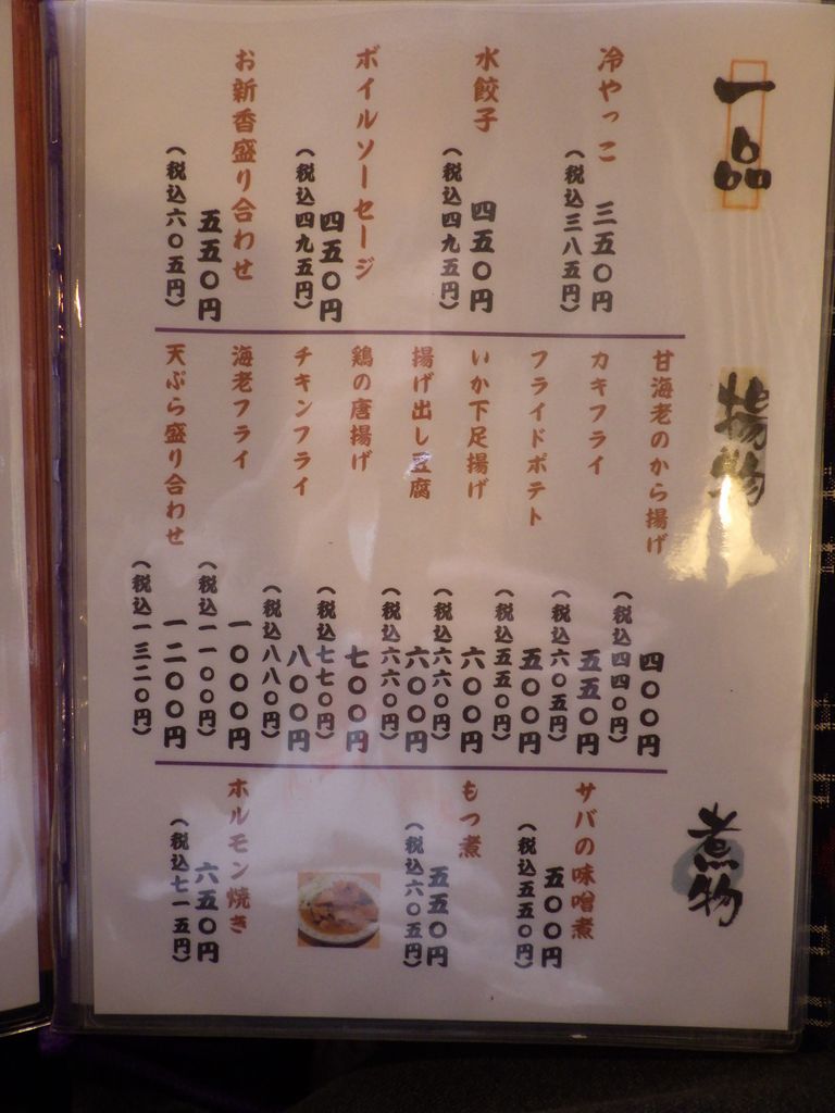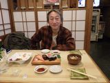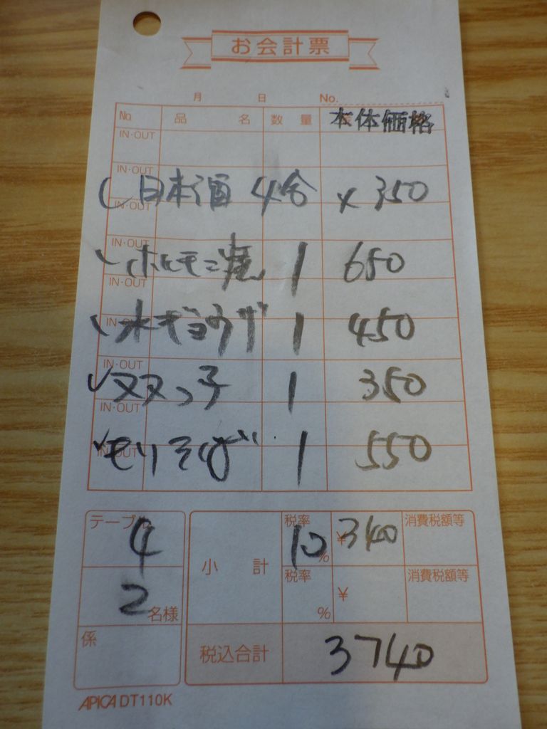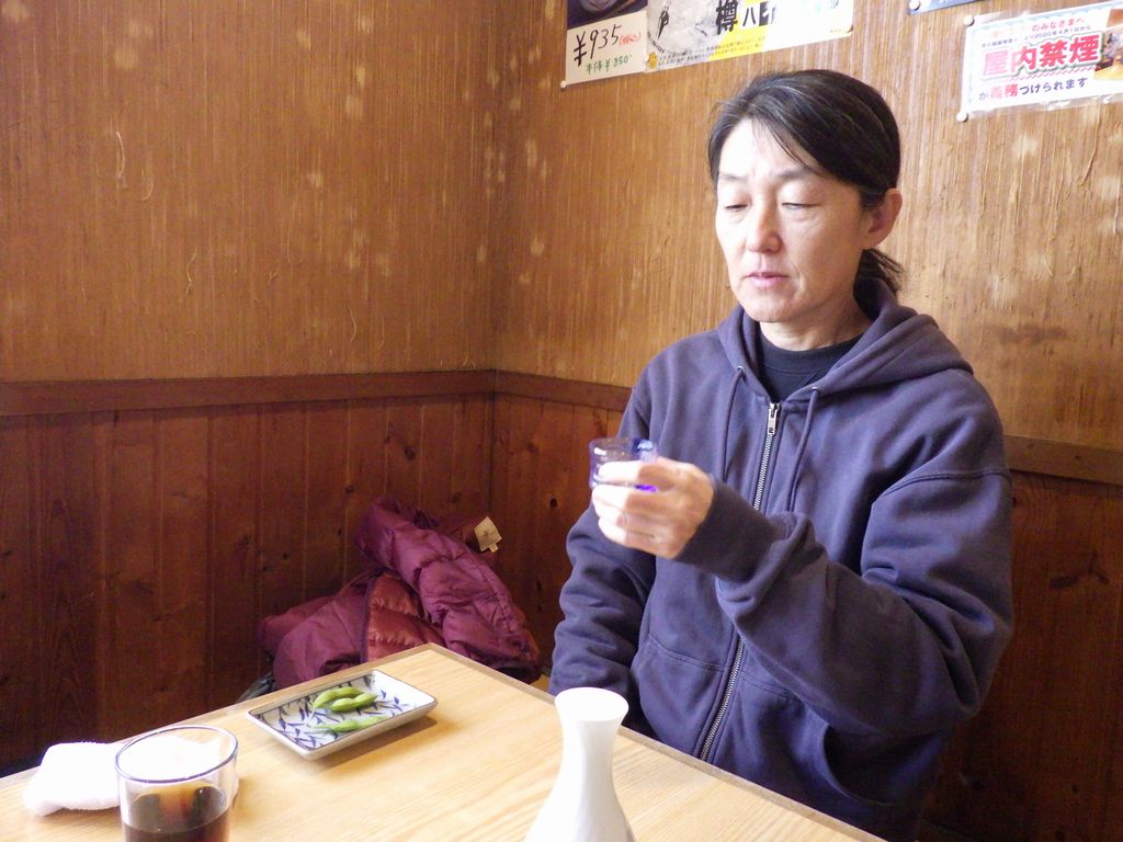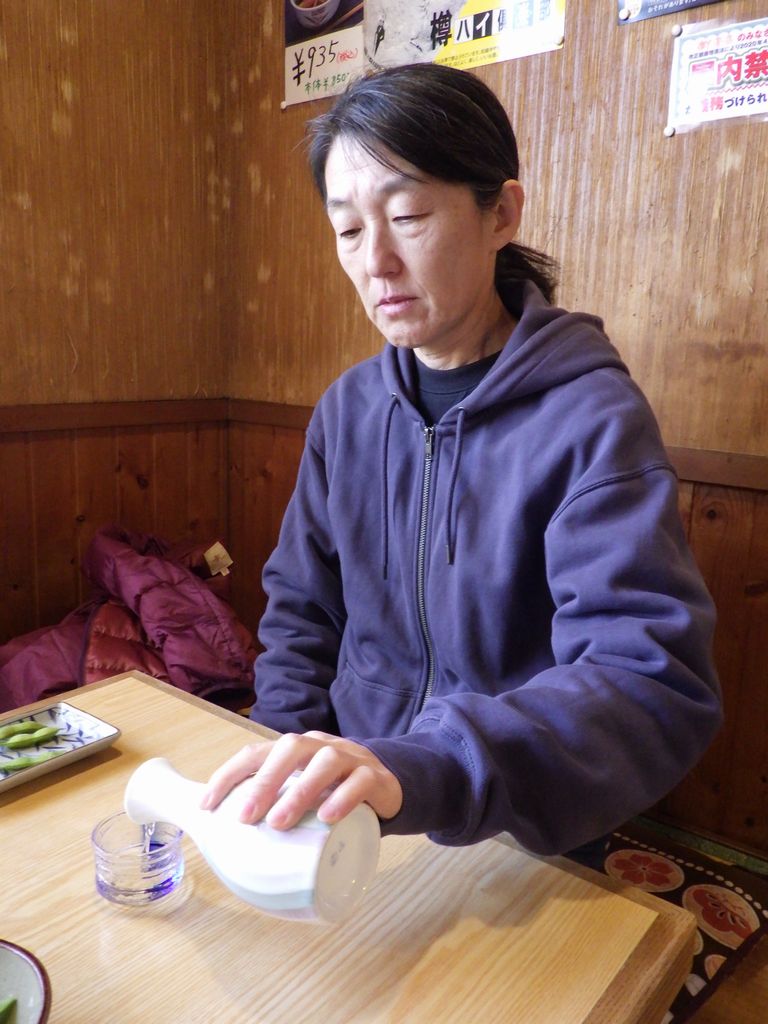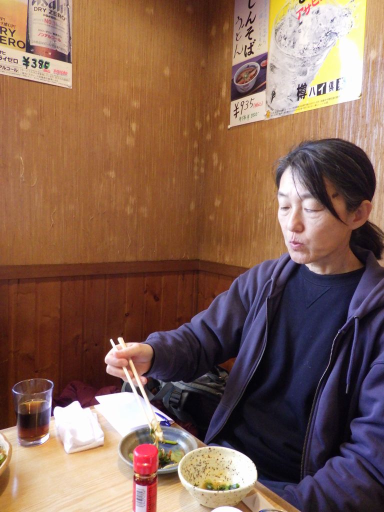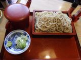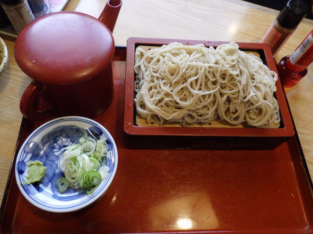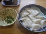 昼食−水餃子、ホルモン焼き、冷やっこ、もりそば、日本酒 (大栗屋)