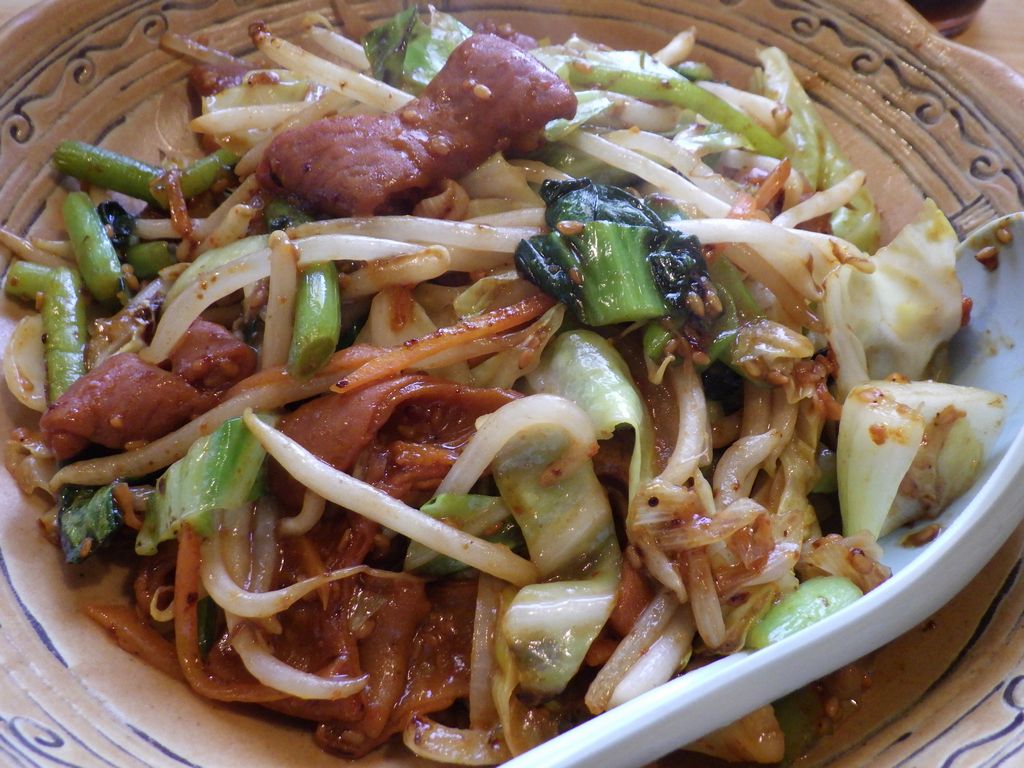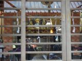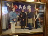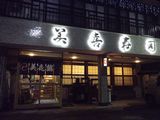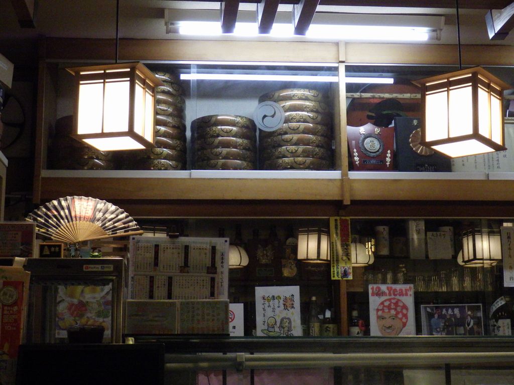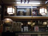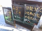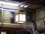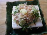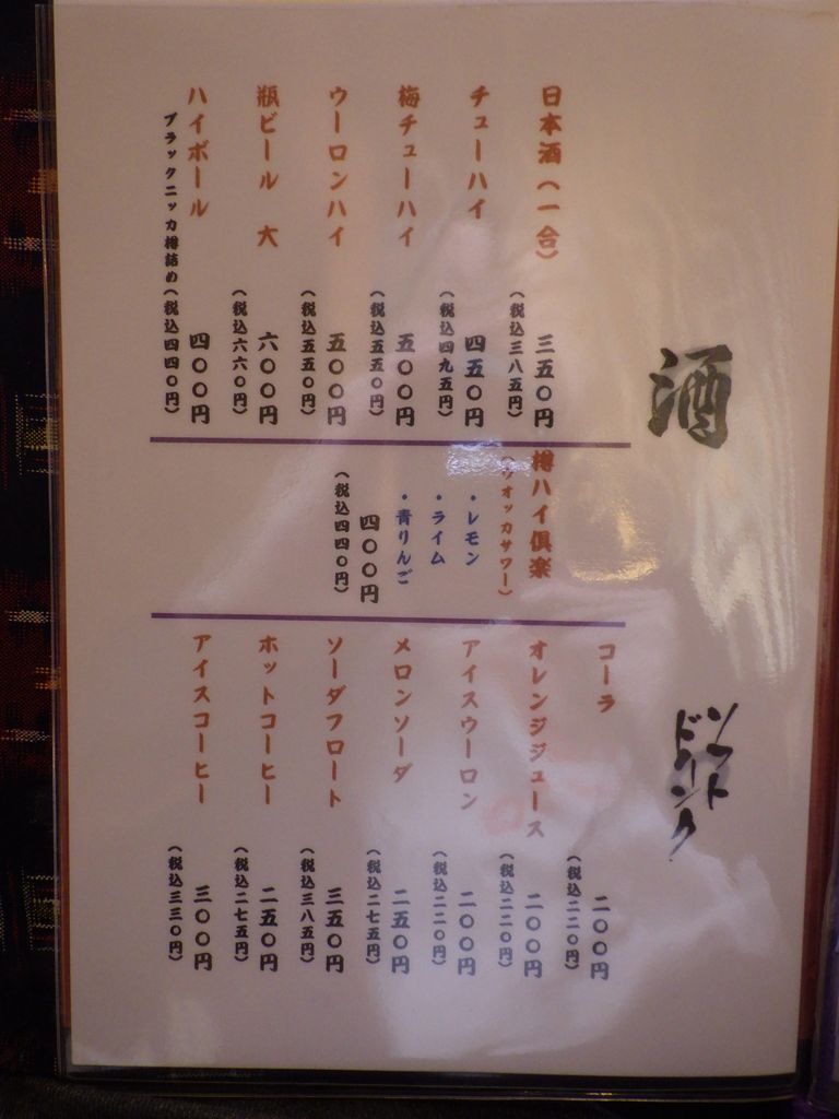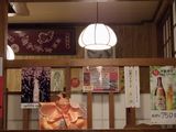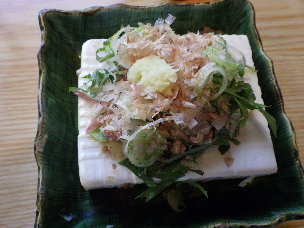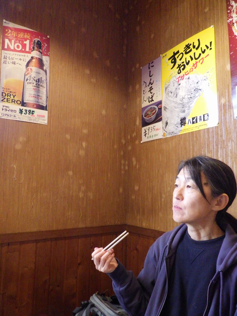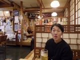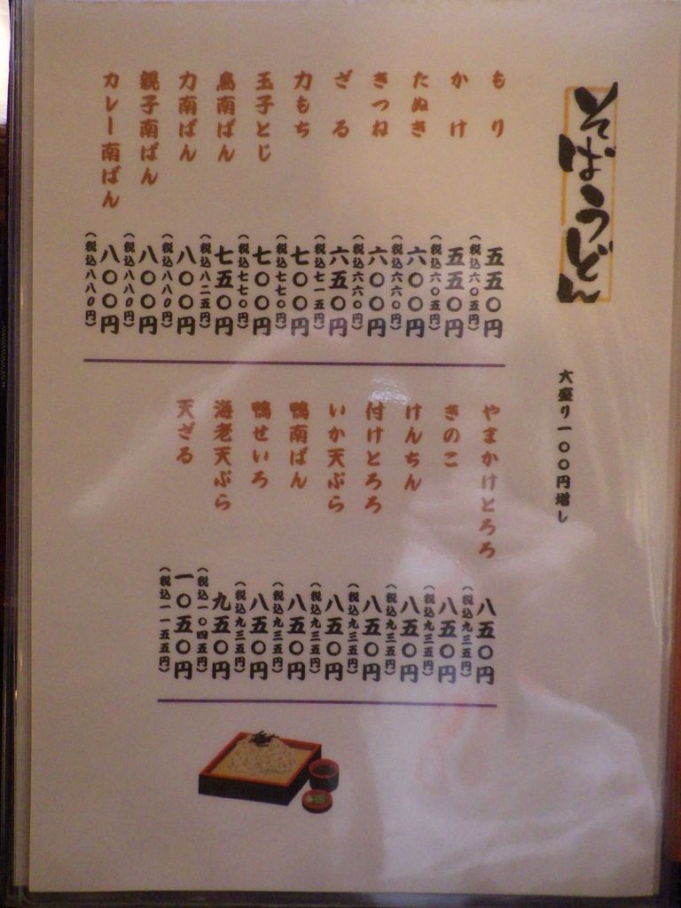 昼食−水餃子、ホルモン焼き、冷やっこ、もりそば、日本酒 (大栗屋)