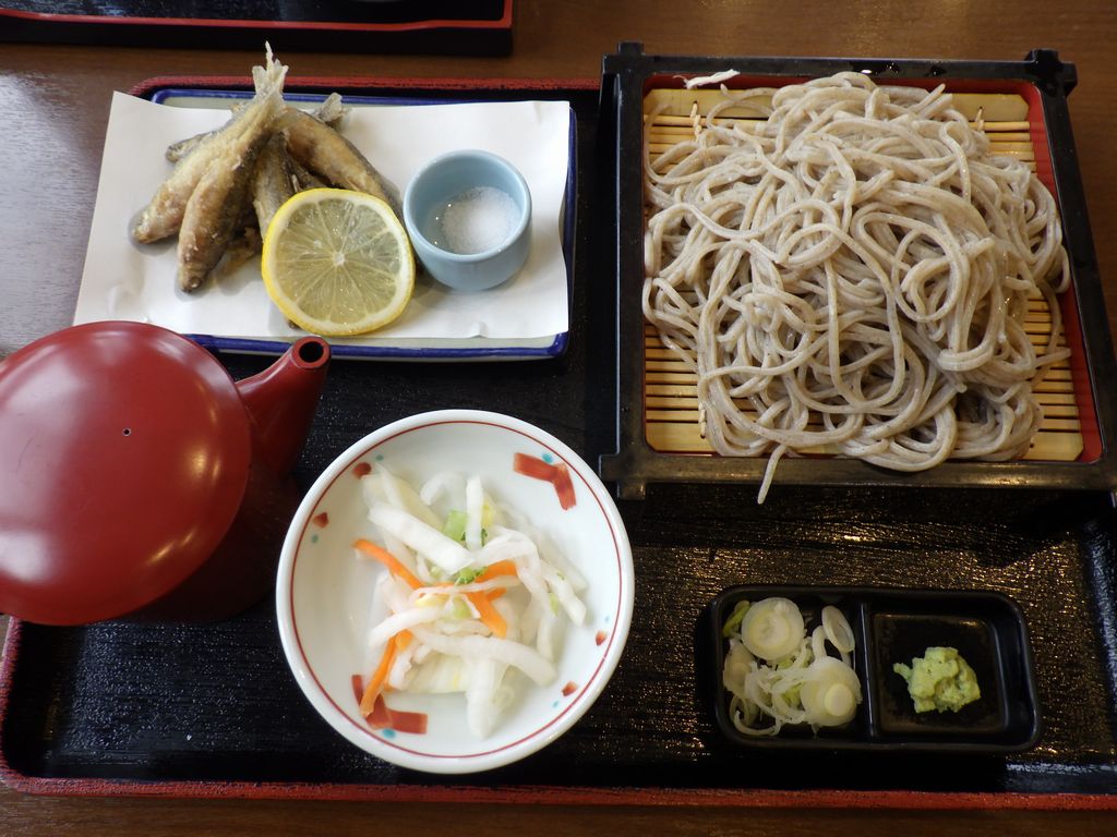 昼食−しもつかれ、ほんもろこ唐揚げ、もりそば、旭興 (道の駅ばとう)