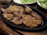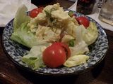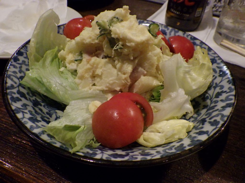 夕食−枝豆、牛ステーキ、ちくわ磯辺揚げ、ポテトサラダ、旭興生鮭、旭興 (サムライ)
