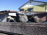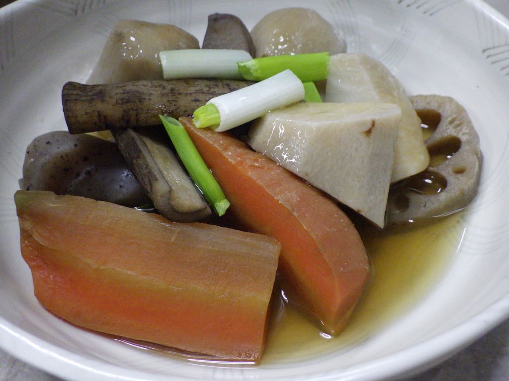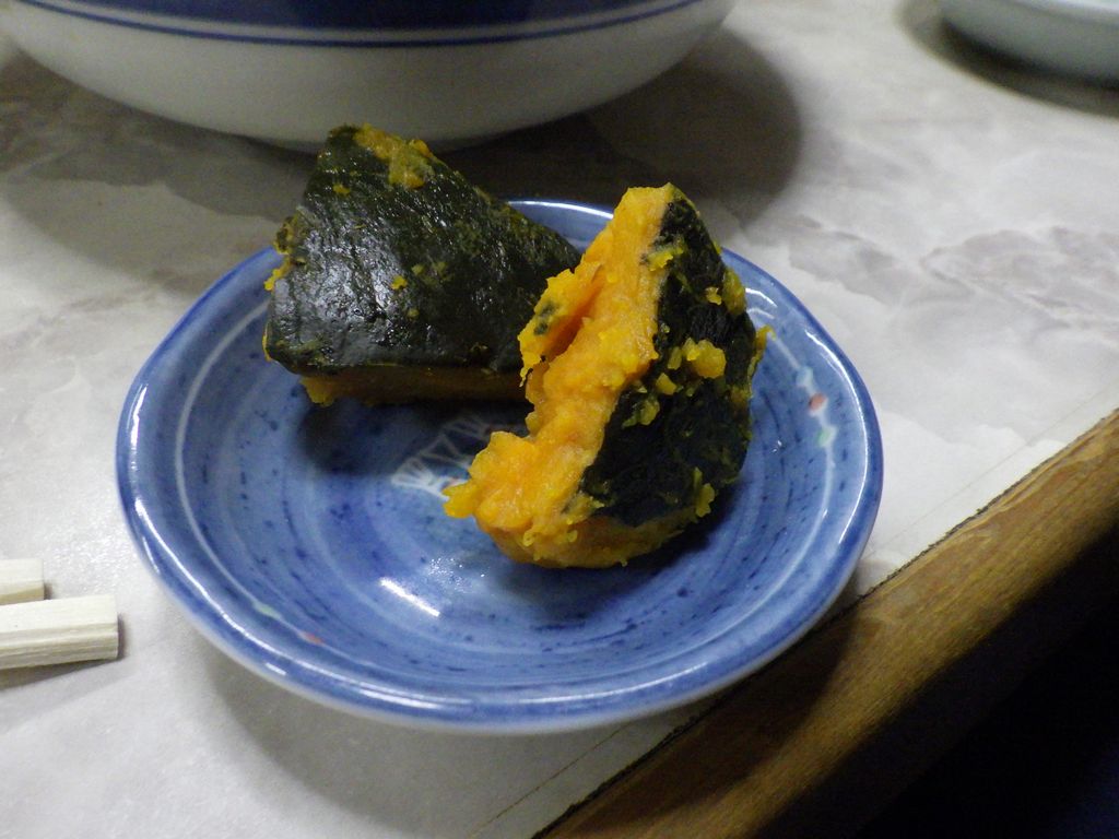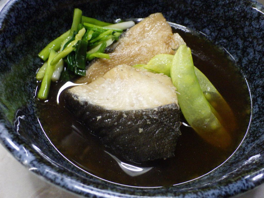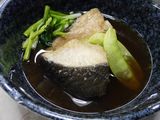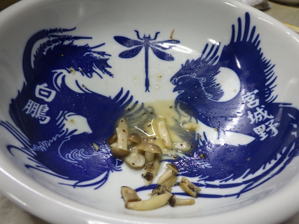 夕食−いも煮汁、銀だら煮、キノコイタメ、ビンビール、樽平、初孫、楯野川 (はな笠)