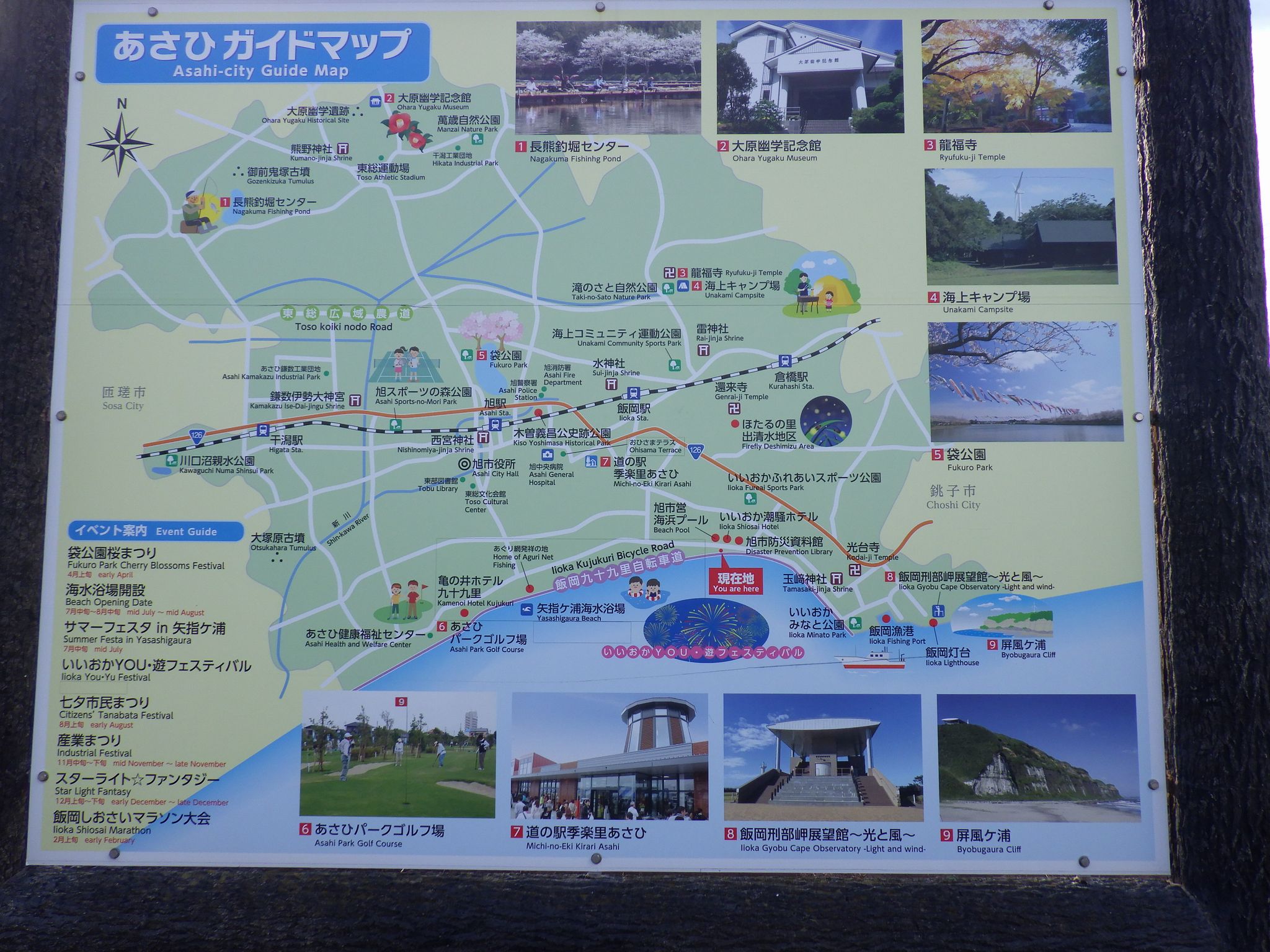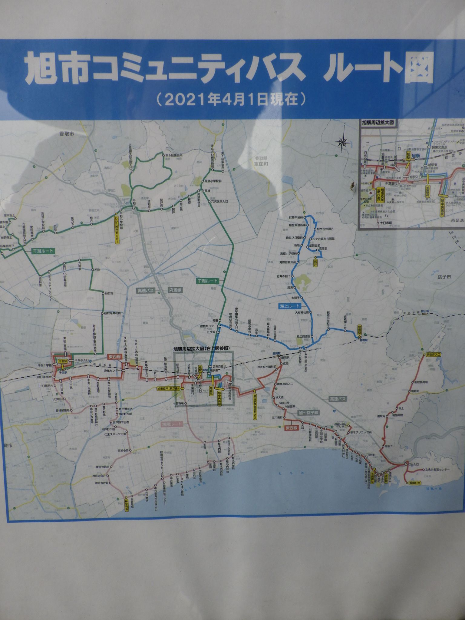 1「BECK'S COFFEE SHOP ペリエ千葉エキナカ」 → 2千葉駅 → 3(しおさい1号) → 4旭駅 → 5木曽義昌公遺跡水葬跡石塔 → 6木曽義昌公史跡公園 → 7(道すがら) → 8東漸寺 → 9(道すがらの総武本線など) → 「ワークマンプラス 旭店」 → ショッピングセンター サンモール → 「ファミリーマート 旭川端店」(喫煙) → 10仲島城跡 (浅間神社) → 11東溜池・西溜池 → 12加納院 → 13(道すがら) → 14金比羅神社 → 15(道すがら) → 16「ファミリーマート 旭東店」 → 17旭市役所 → 千葉県立東部図書館 → 18仁玉川 → 旭市役所 → (旭市コミュニティバス東西線) → 永井丘バス停 → 19花蔵院 → 20漁師さんちのごはん「しらす亭」 → 21飯岡浪切不動尊 → 22玉ア神社 (下総二宮) → 23(道すがらの飯岡助五郎関連の史跡、津波ひなんタワーなど) → 24太平洋 → 25飯岡ライオンズ公園 (波と飯岡石のモニュメント、東日本大震災旭市飯岡津波被災の碑、矢吹丈像、展望台) → 26旭市防災資料館 → 27荻園庚申塚 → 28毘沙門天・荻園神社 → 29(道すがら) → 30横根神社 → 31矢挿八幡神社 → 32(道すがらのネコ) → 33(道すがらのお地蔵さん、愛宕神社遠景、玉垣など) → 34三峯神社 → 35定慶寺 → 光台寺 (入口がわからず断念) → 港町食堂「地雷や」(外から見ただけ) → 36(飯岡漁港近辺) → 37居酒屋「鳥忠」 → 38漁師さんちのごはん「しらす亭」 → (アステル交通 (旧飯岡タクシー) ) → 39グロリアケープタワーホテル