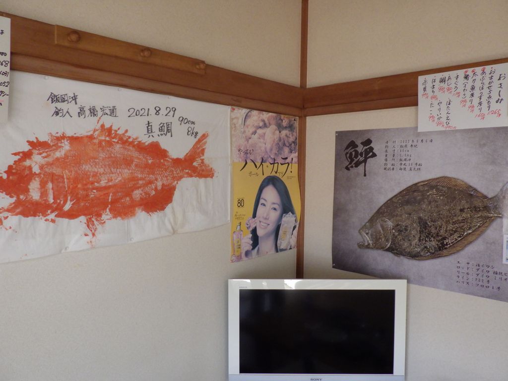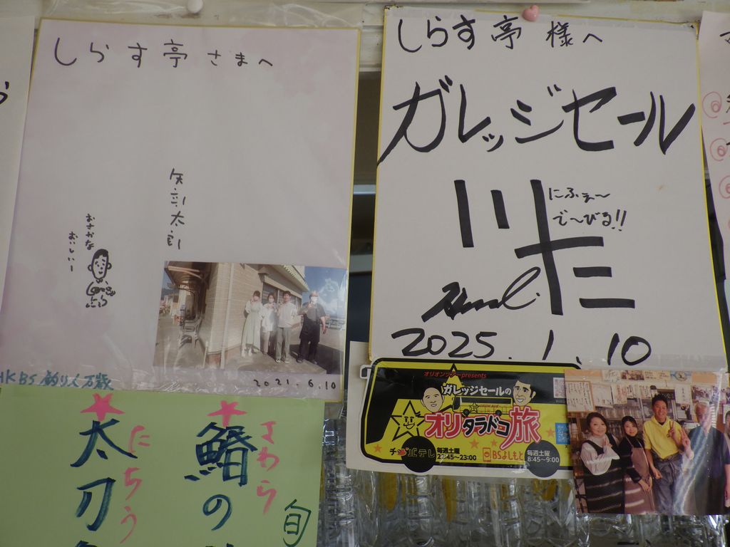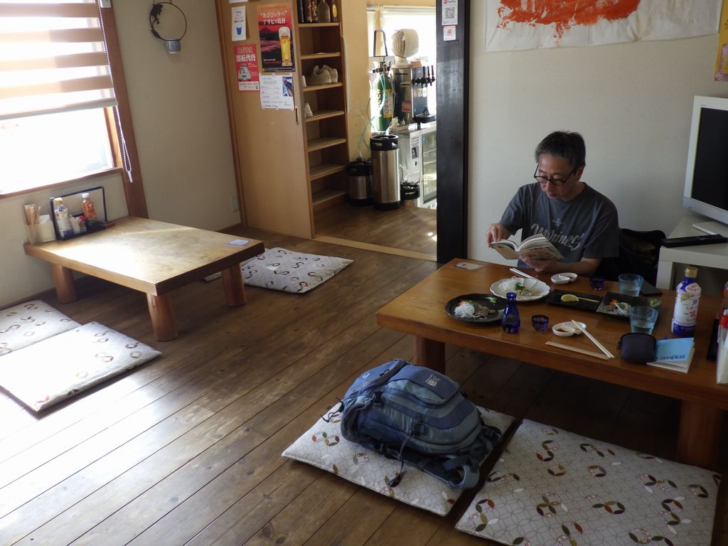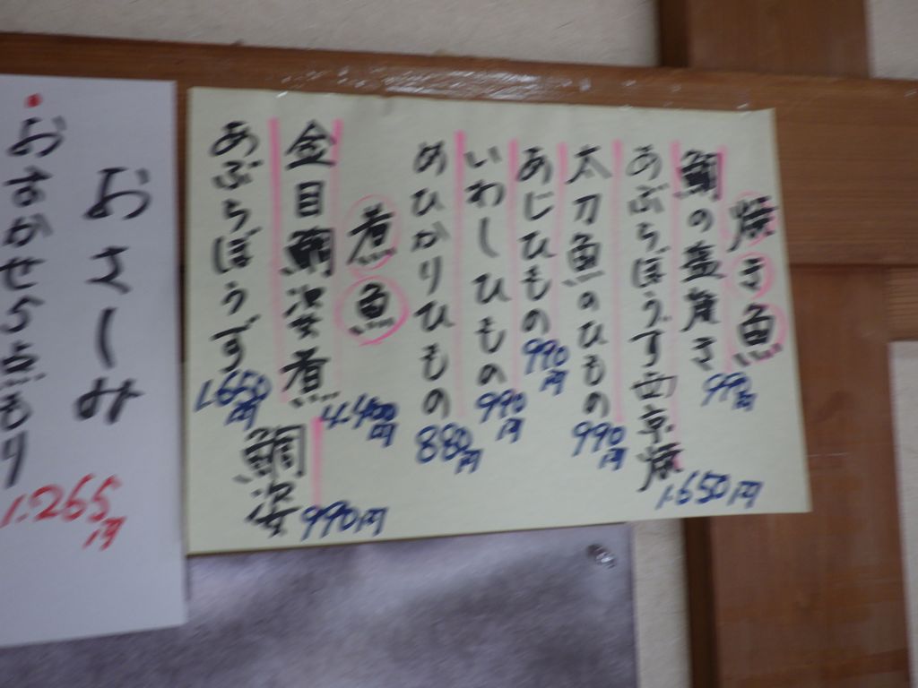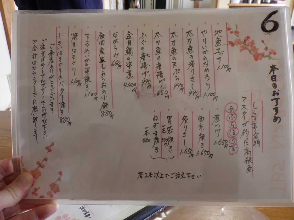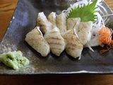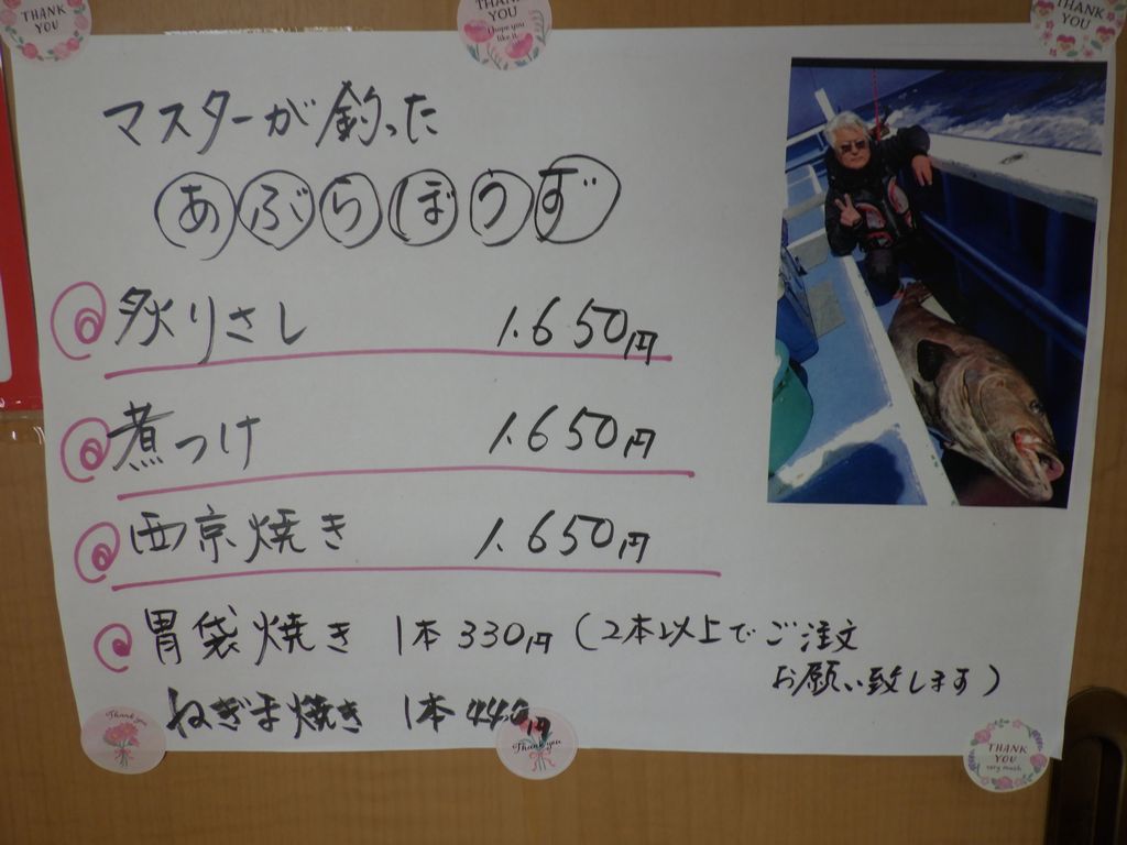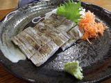 昼食−あぶらぼうず炙り、太刀魚の炙りさし、あぶらぼうず胃袋焼き、やりいかのなめろう、幽学の里 (しらす亭)
