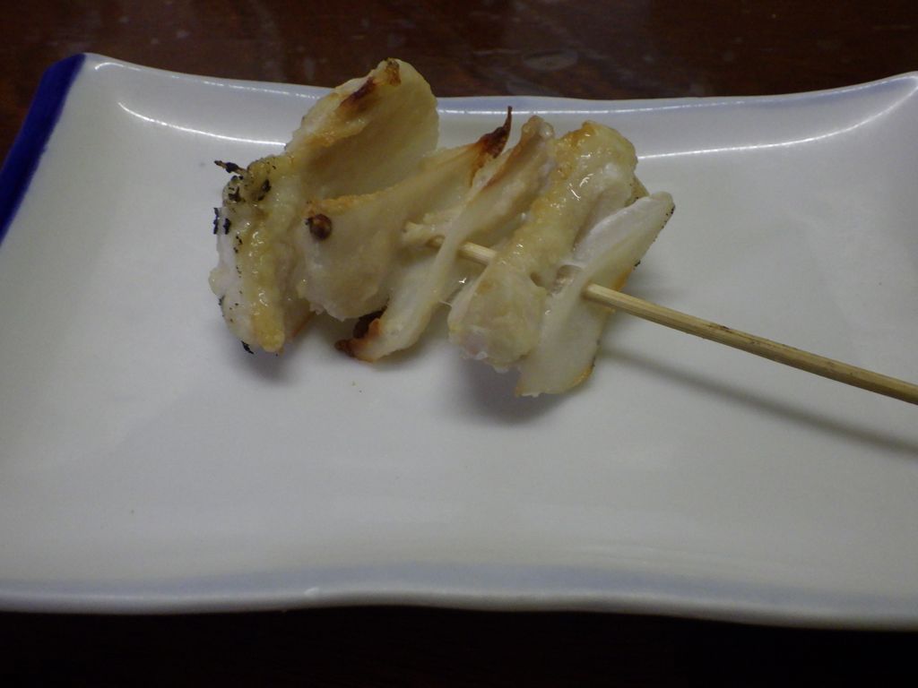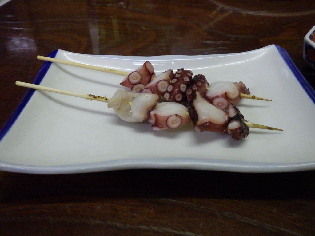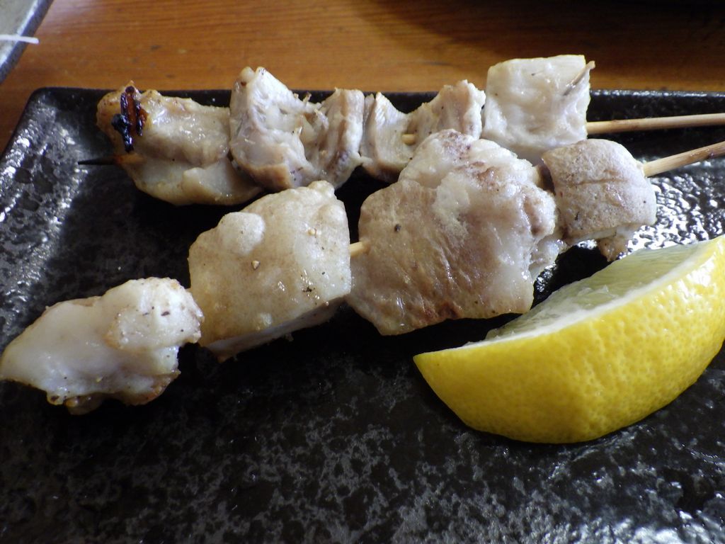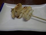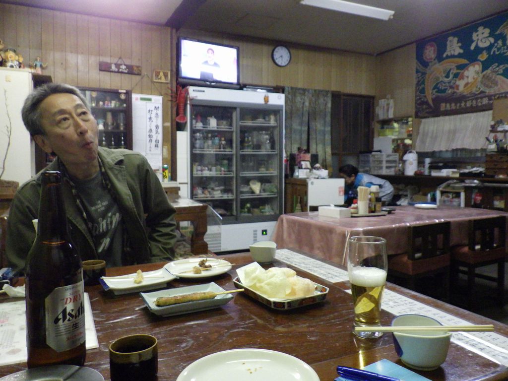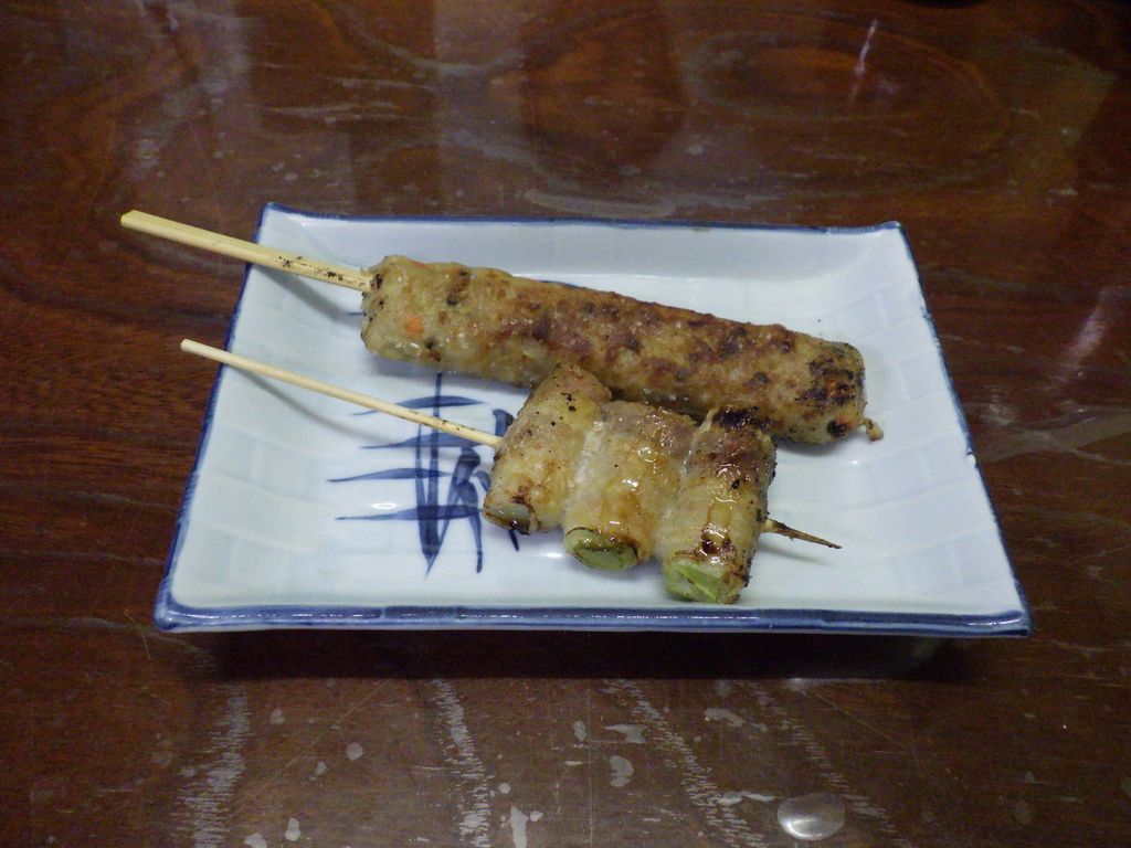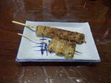 夕食1−なんこつ、つくね、レバー、とり皮串、豚ねぎ串、えびせん (プレゼント)、タコ串、もろきゅう、イカフライ、アサヒ瓶ビール、お酒 (大とっくり) (鳥忠)