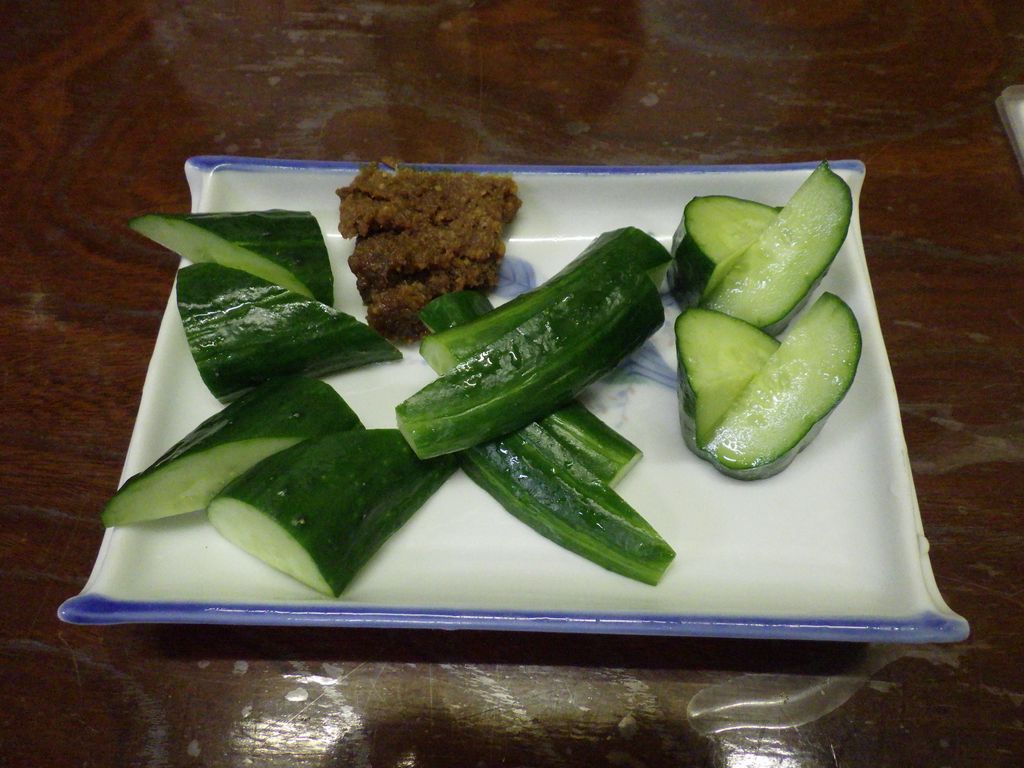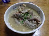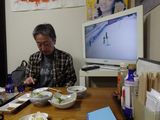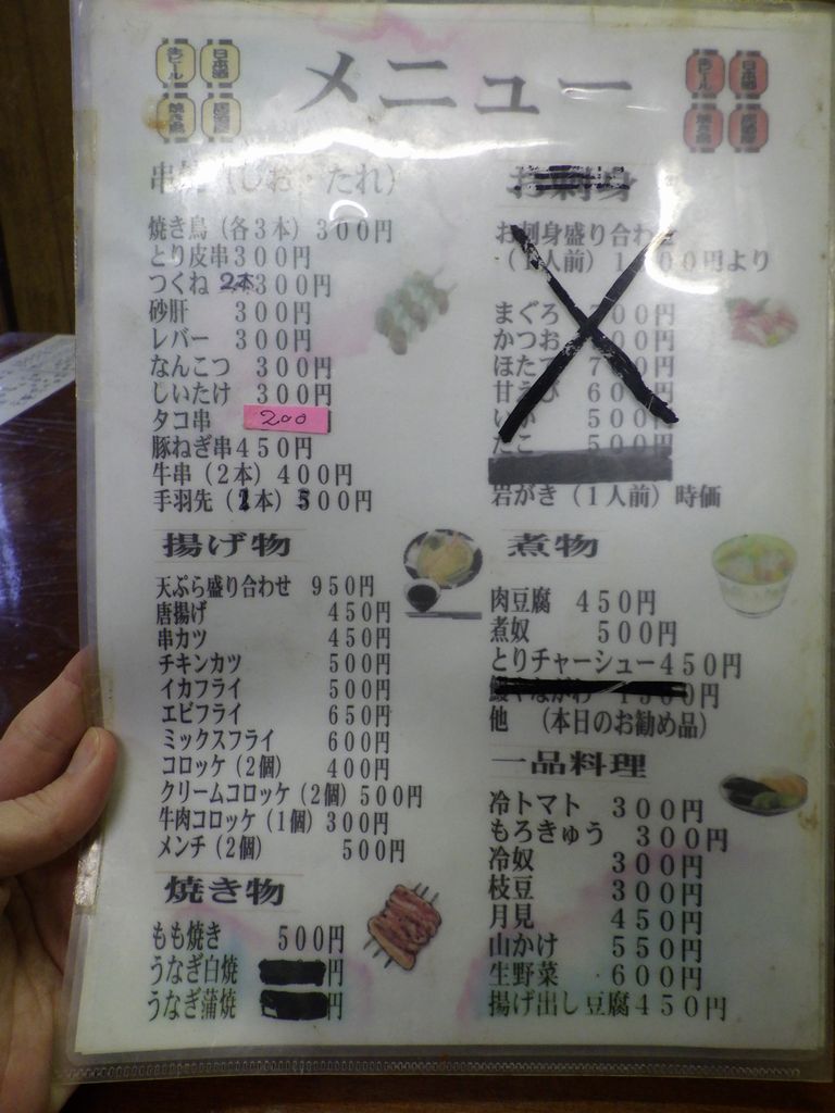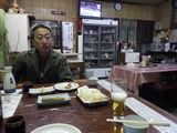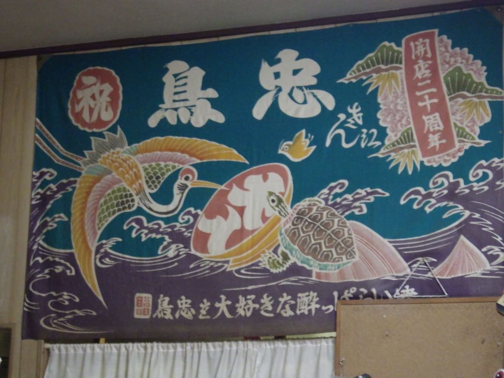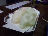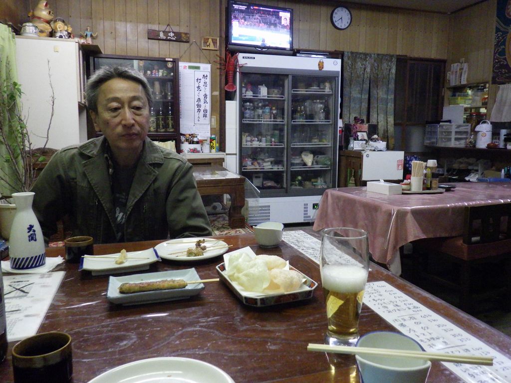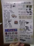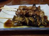 夕食1−なんこつ、つくね、レバー、とり皮串、豚ねぎ串、えびせん (プレゼント)、タコ串、もろきゅう、イカフライ、アサヒ瓶ビール、お酒 (大とっくり) (鳥忠)