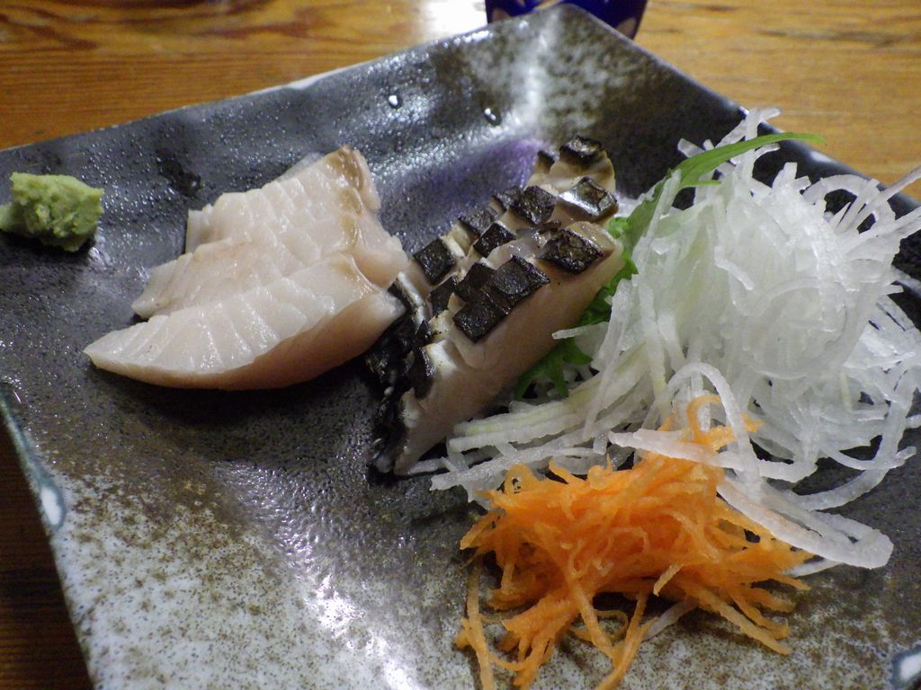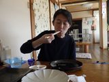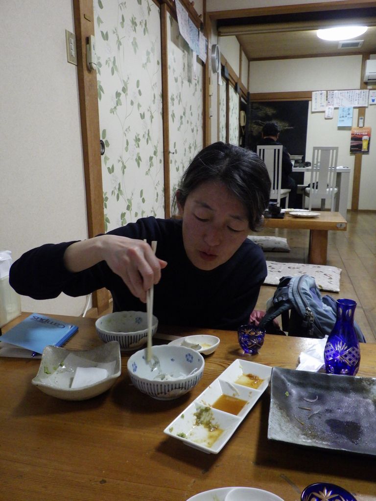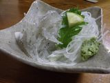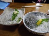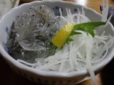 夕食2−生しらすの小鉢、鰆さしみ、もつ煮、しらうおの小鉢、幽学の里 (しらす亭)