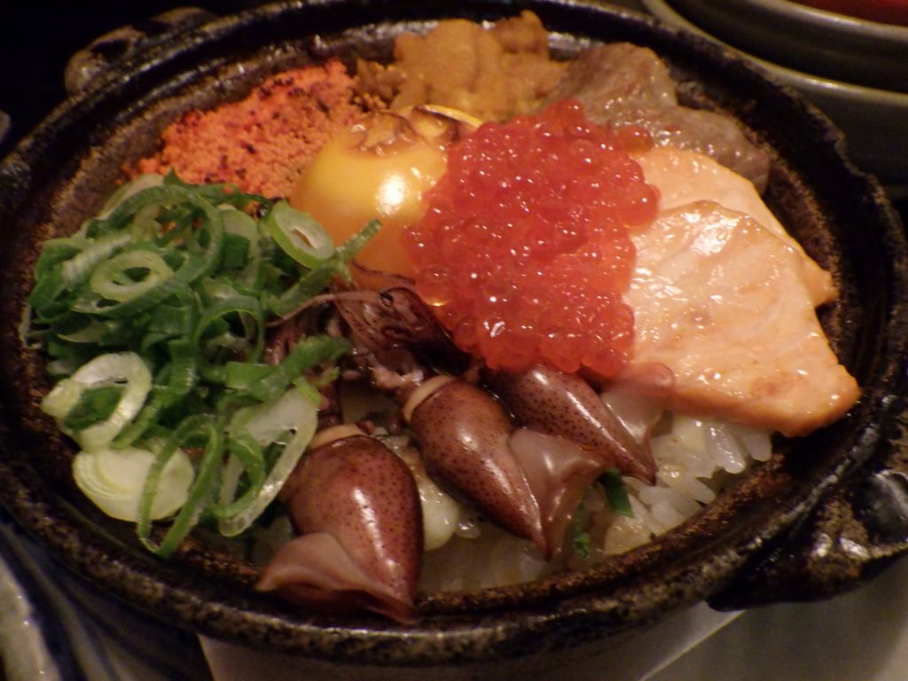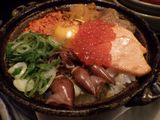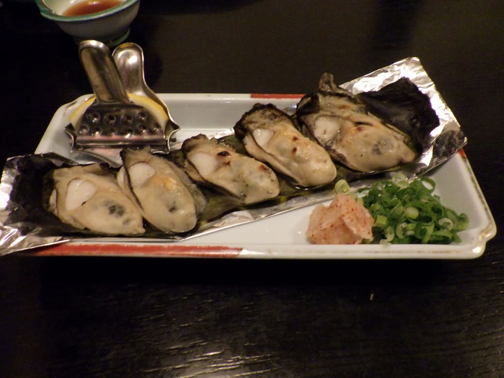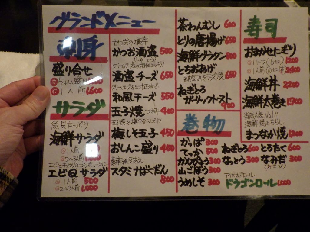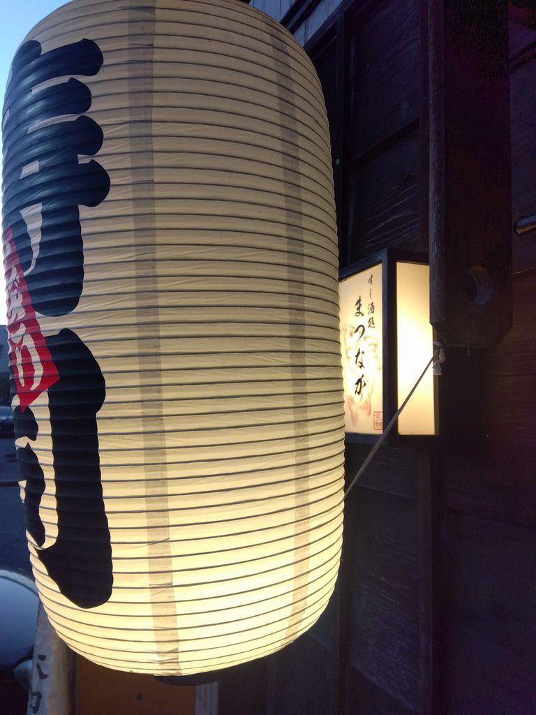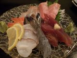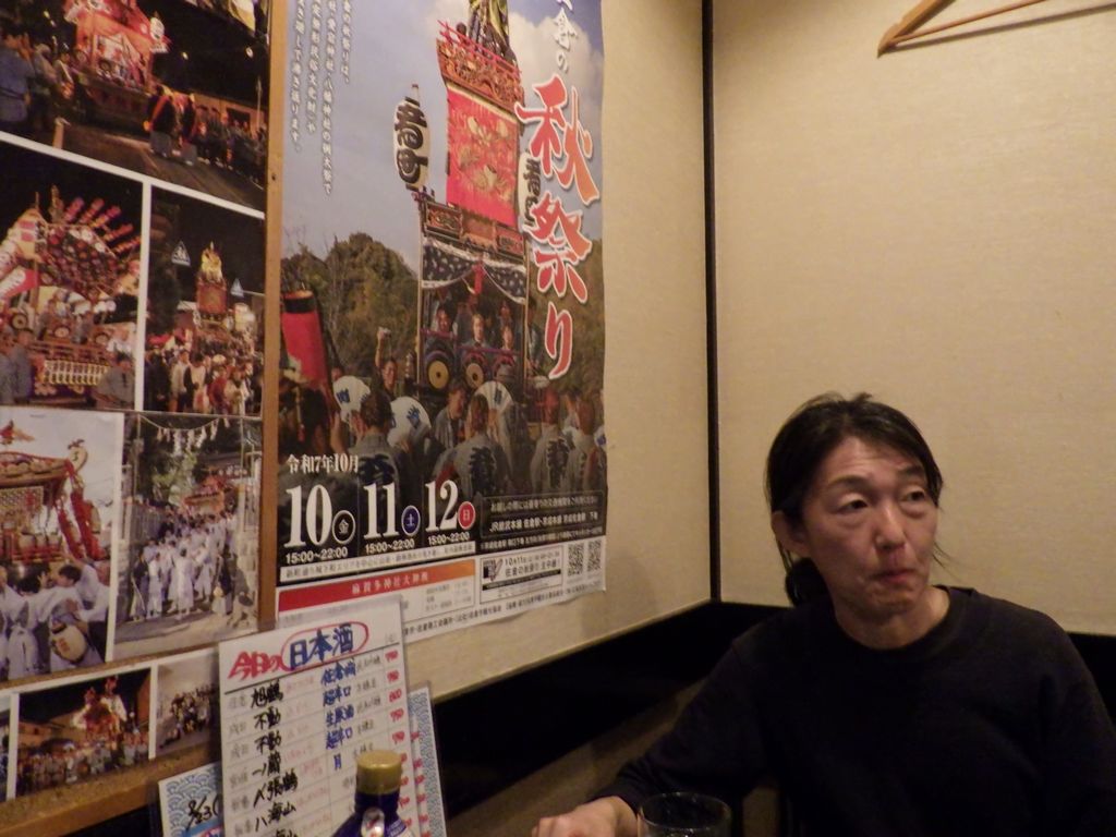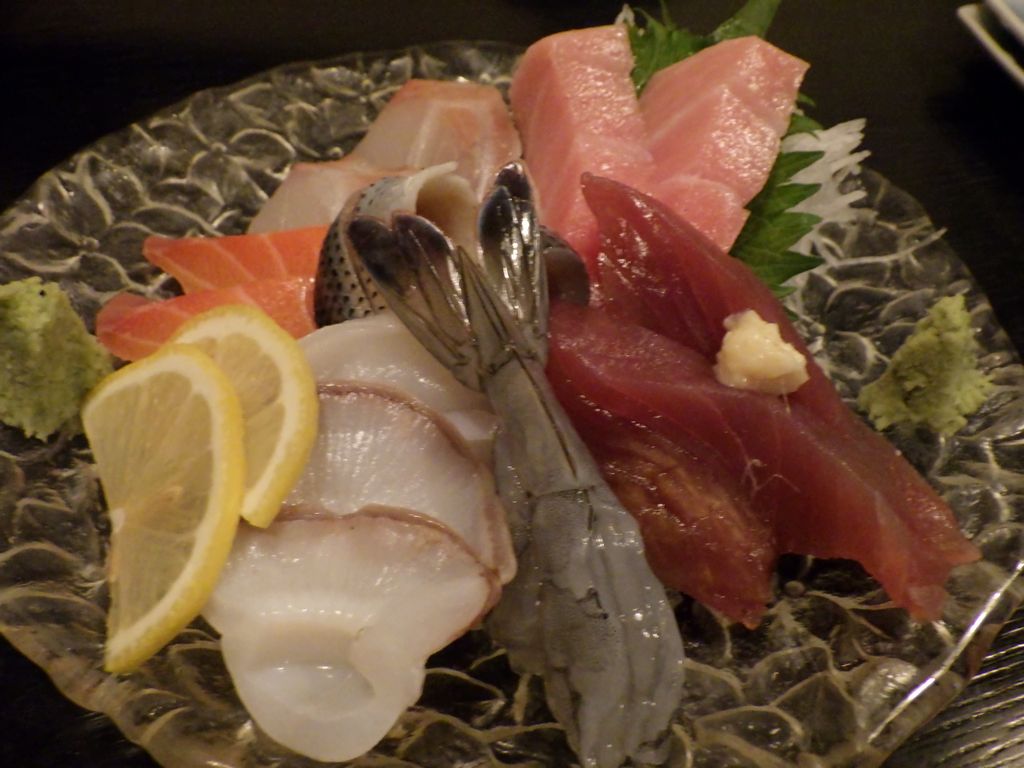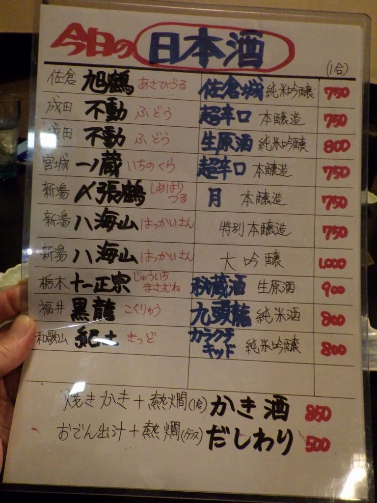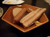夕食−刺身盛り合せ、おでん (ちくわぶ、大根、もち巾、ウィンナー)、カキ昆布焼、まつなか焼 (海鮮焼きちらし)、佐倉城、十一正宗、不動生原酒、〆張鶴 (月) (まつなか)
